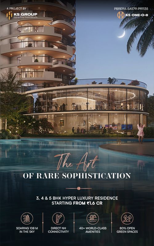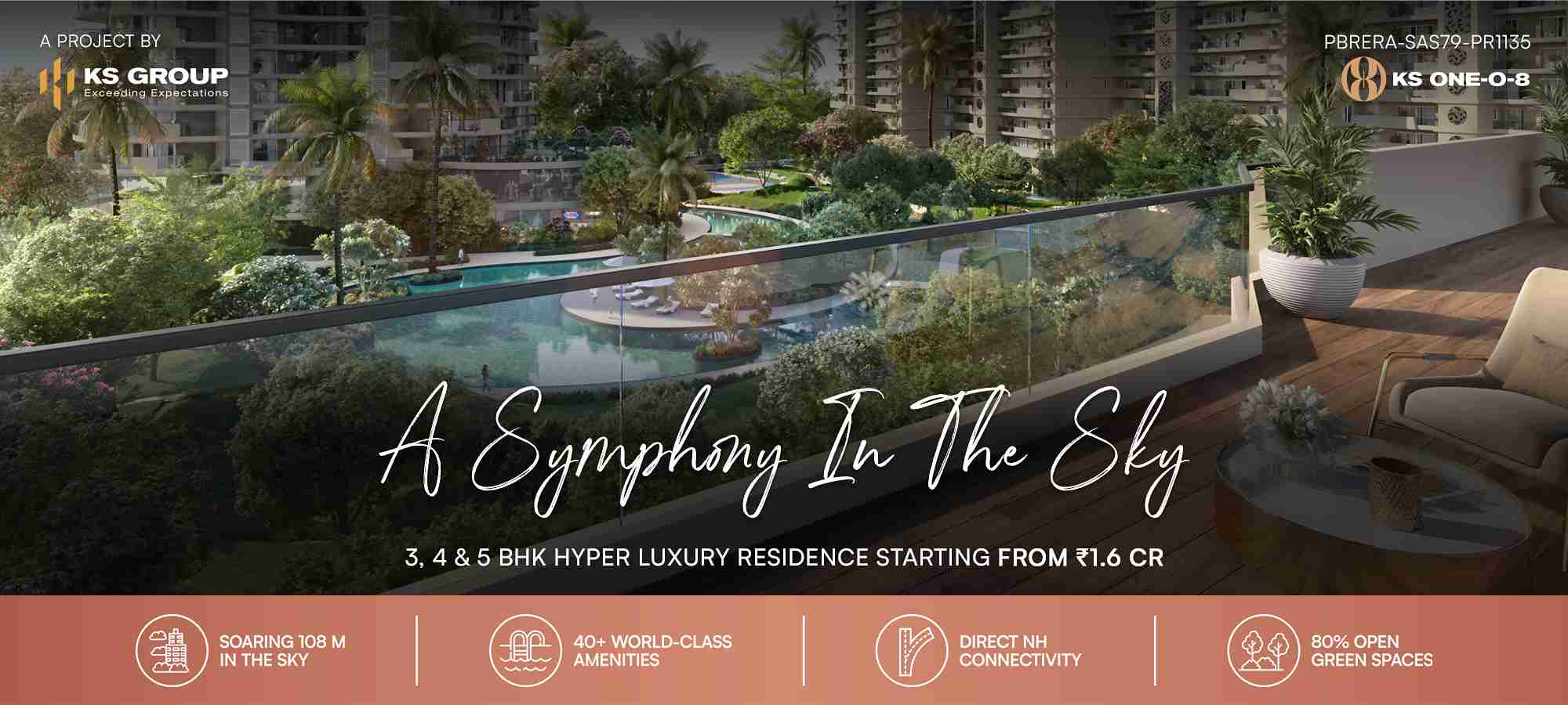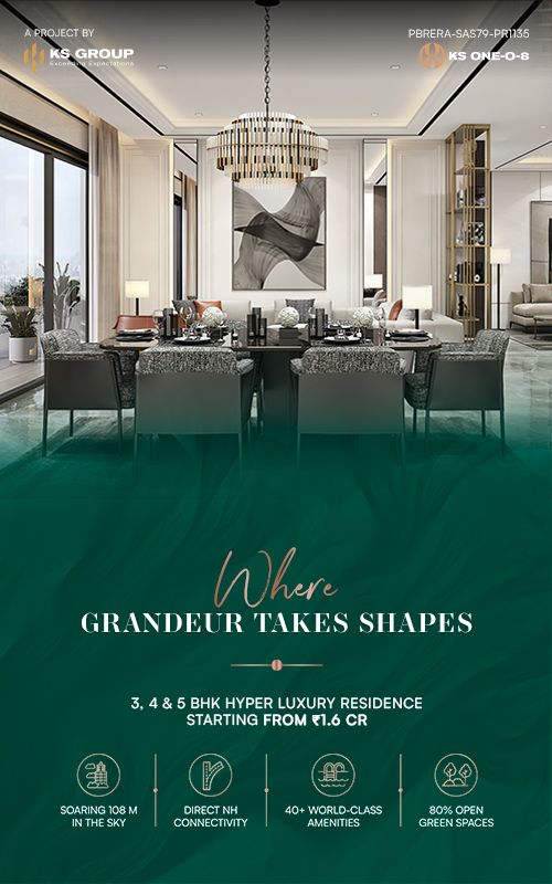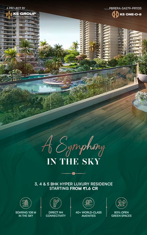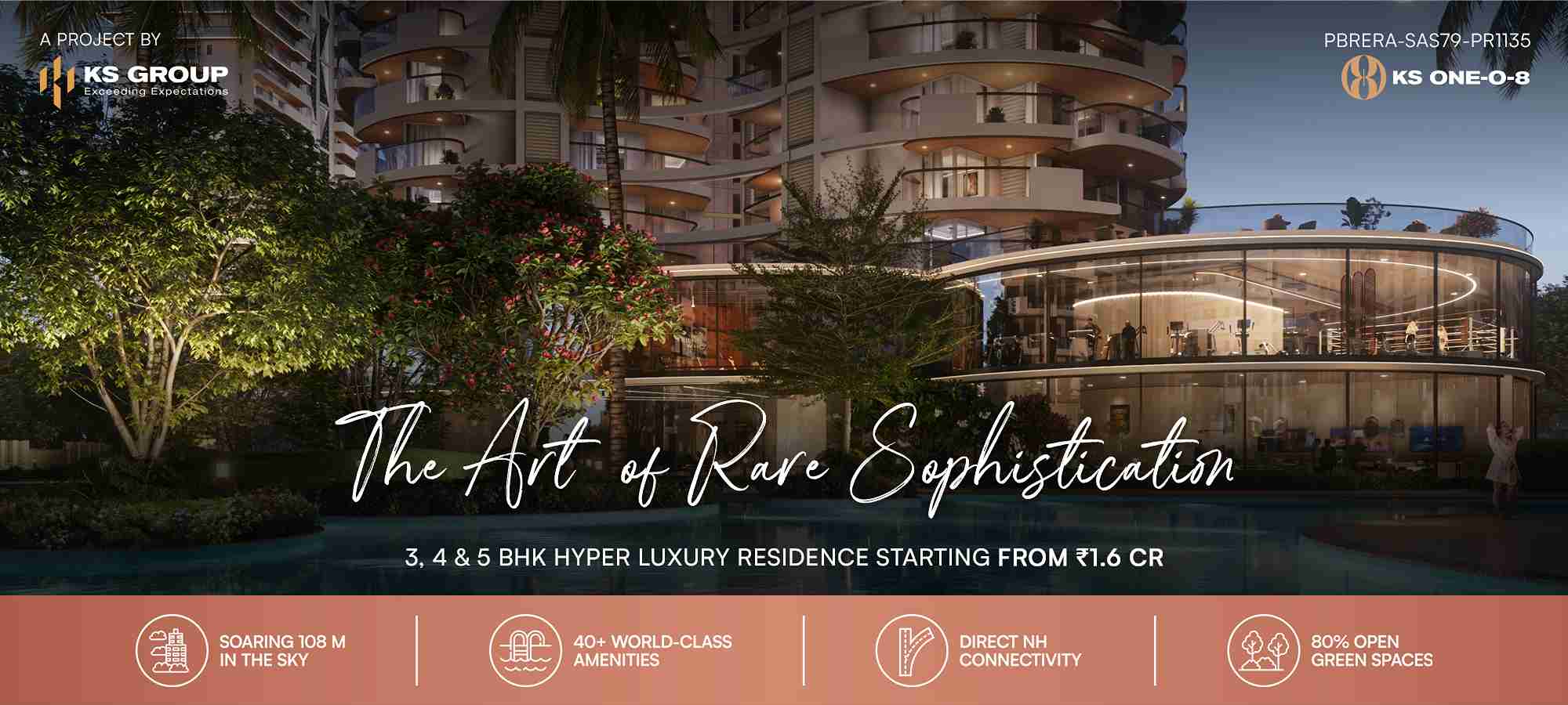 KS ONE-O-8, Where dreams rise as high as the skyline. Soaring 108 metres into the sky, KS ONE-O-8 is Tricity's most iconic residential landmarks. A sublime fusion of architectural brilliance and exceptional luxury. Strategically positioned on the Chandigarh-Delhi National Highway, it ensures seamless connectivity to the region's most sought- after destinations. This architectural masterpiece is adorned with 40+ luxury amenities, from a private cinema and five-star clubhouse to a serene wellness spa and a celestial stargazing deck, all set amidst 80% open green landscapes. Each residence is a harmonious blend of space, light, and refinement, with expansive layouts, panoramic views, and interiors finished with exquisite care. More than an address, KS ONE-O-8 is a refined retreat, a timeless expression of elegance, privacy, and quiet distinction.